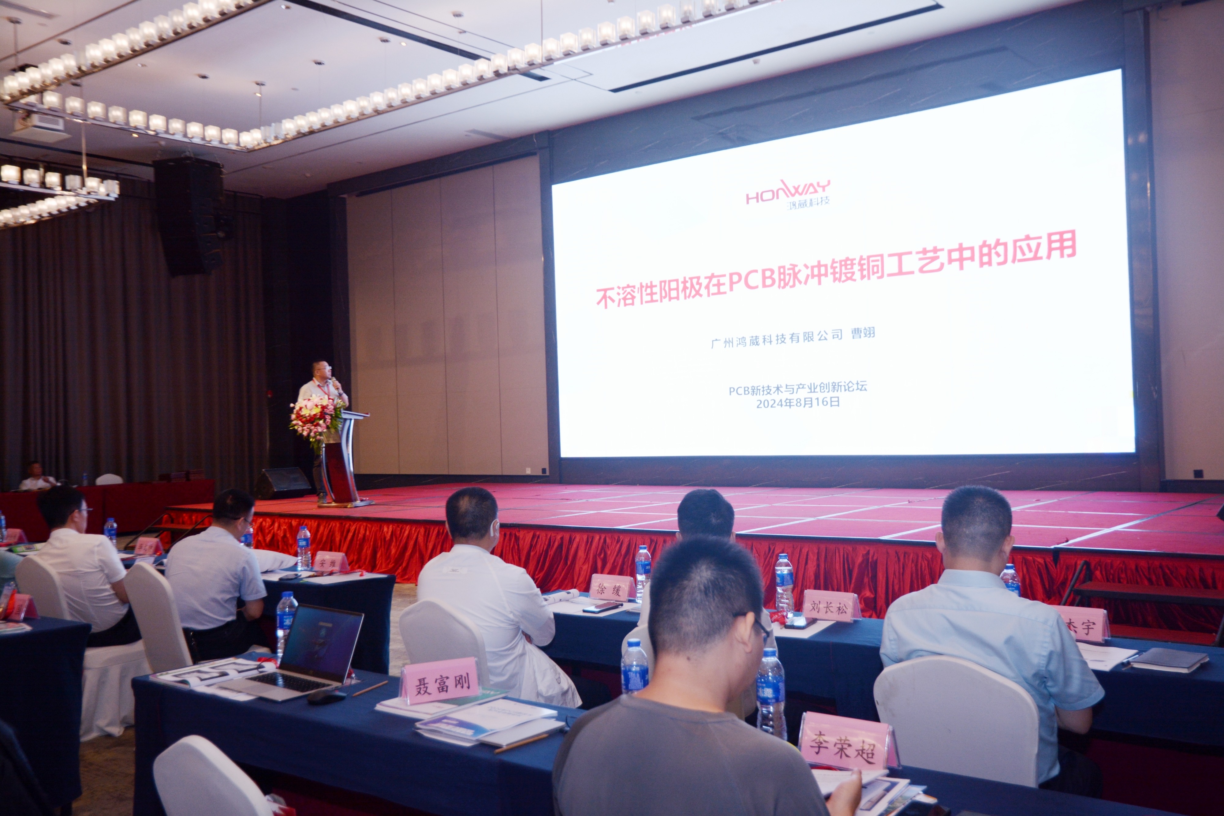 廣州鴻葳科技有限公司總經(jīng)理李勇、執(zhí)行總經(jīng)理劉德章、電極事業(yè)部總經(jīng)理喻建國、總工程師曹翊博士、銷售總監(jiān)羅慧梅等受邀出席會議。會上,曹翊博士作了“不溶性陽極在PCB脈沖鍍銅工藝中的應(yīng)用”報告,分析鴻葳不溶性陽極在PCB脈沖鍍銅工藝中的獨特優(yōu)勢與應(yīng)用潛力,吸引了在場專家與企業(yè)代表的熱烈關(guān)注與討論。