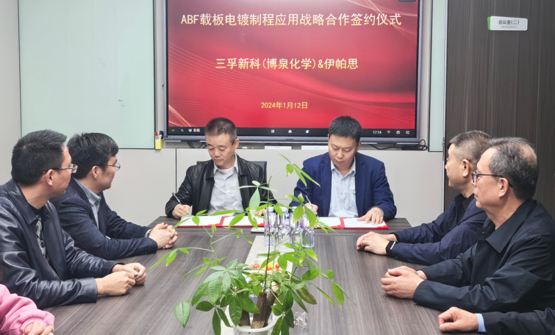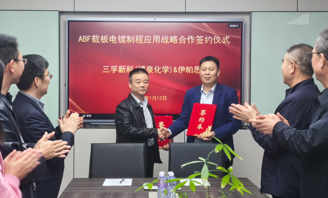 1月12日,三孚新科旗下高端線路板藥水供應(yīng)商江西博泉化學(xué)有限公司與深圳伊帕思新材料科技有限公司戰(zhàn)略簽約儀式于伊帕思知識(shí)城研發(fā)中心圓滿舉行。本次戰(zhàn)略合作,雙方將就IC載板基材積層膠膜領(lǐng)域、特化品電鍍藥水領(lǐng)域等進(jìn)行技術(shù)合作、研發(fā)應(yīng)用,實(shí)現(xiàn)合作共贏,為提高國(guó)內(nèi)FCBGA封裝用ABF載板國(guó)產(chǎn)化貢獻(xiàn)力量。