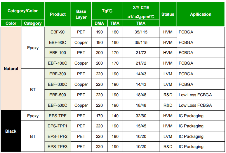 伊帕思積極布局ABF載板原材料產(chǎn)品線,公司自主研發(fā)的積層膜EBF是一種低熱膨脹系數(shù)、低介電損耗的熱固性薄膜,適用于線路更為精細(xì)、封裝密度更高的CPU、GPU、FPGA、ASIC等高性能運(yùn)算芯片中。目前已形成系列產(chǎn)品,并在重要終端客戶及下游客戶中開展驗(yàn)證。塑封膜TPF是一款應(yīng)用在WLP、PLP領(lǐng)域的膜材,該膜材耐熱以及粘結(jié)力可靠性能俱佳。目前已經(jīng)在多家封裝客戶認(rèn)證與小批量使用。
