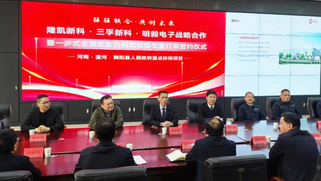 3月31日,在河南省漯河市,隆凱新材料科技(河南)有限公司、廣州三孚新材料科技股份有限公司、廣州明毅電子機(jī)械有限公司,正式簽署三方戰(zhàn)略合作協(xié)議,并完成首批一步式全濕法復(fù)合銅箔設(shè)備訂單簽約。在漯河市舞陽(yáng)縣委常委、常務(wù)副縣長(zhǎng)趙華峰的帶領(lǐng)下,縣政府、經(jīng)開(kāi)區(qū)、商務(wù)局、科技局、閩東南招商服務(wù)中心的主要負(fù)責(zé)人,與三方企業(yè)高層齊聚一堂,共同見(jiàn)證簽約儀式的圓滿(mǎn)舉行。簽約儀式由隆凱新科董事長(zhǎng)王躍彬,三孚新科董事、副總經(jīng)理陳維速,明毅電子總經(jīng)理鄧高榮共同完成。此舉標(biāo)志著三方深度合作正式拉開(kāi)序幕,共同開(kāi)啟新能源鋰電池行業(yè)創(chuàng)新與發(fā)展的新篇章。