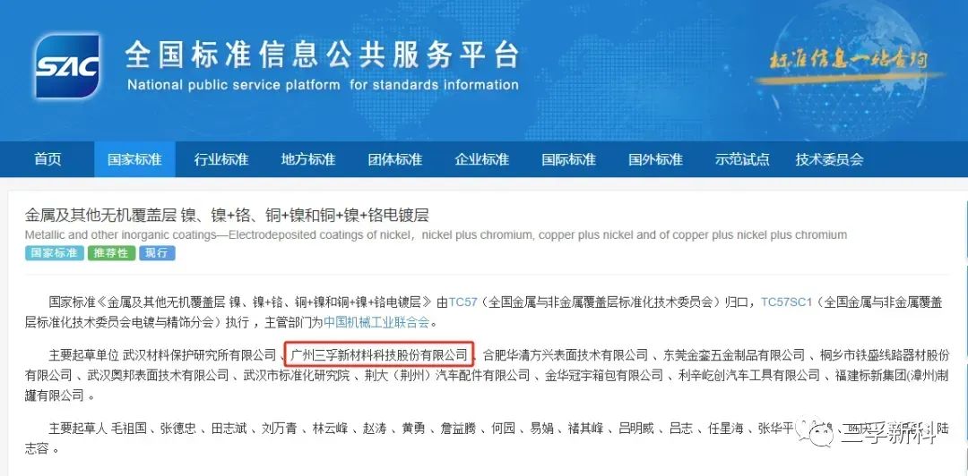 在知識(shí)產(chǎn)權(quán)管理之外,三孚新科也積極參與到行業(yè)國(guó)標(biāo)的制定工作中,如⌈GB/T 9797-2022金屬及其他無(wú)機(jī)覆蓋層 鎳、鎳+鉻、銅+鎳和銅+鎳+鉻電鍍層⌋、⌈GB/T 39495-2020 金屬及其他無(wú)機(jī)覆蓋層 鋁及鋁合金無(wú)鉻化學(xué)轉(zhuǎn)化膜⌋、⌈GB/T 43099-2023金屬及其他無(wú)機(jī)覆蓋層 錫鈷合金電鍍層(2024年4月1日實(shí)施)⌋,三孚新科均以主要起草單位參與國(guó)標(biāo)制定。三孚新科將持續(xù)協(xié)助推動(dòng)行業(yè)國(guó)標(biāo)更新升級(jí),為表面工程行業(yè)高質(zhì)量發(fā)展做出貢獻(xiàn)